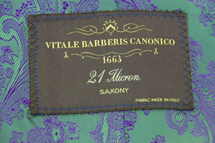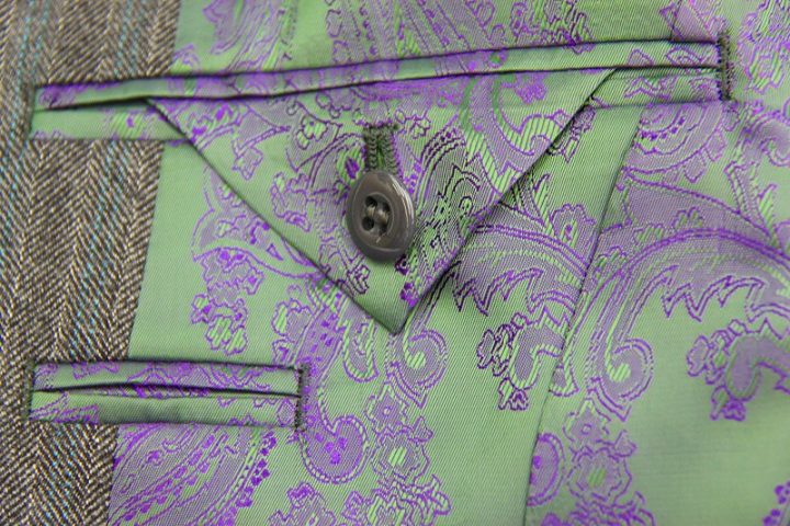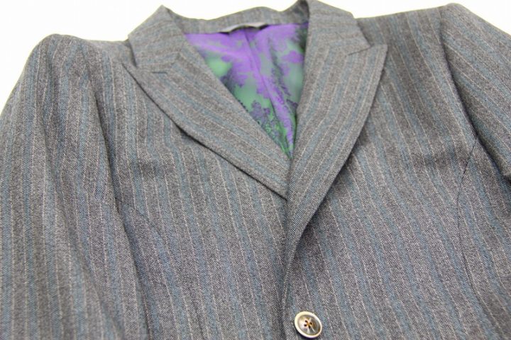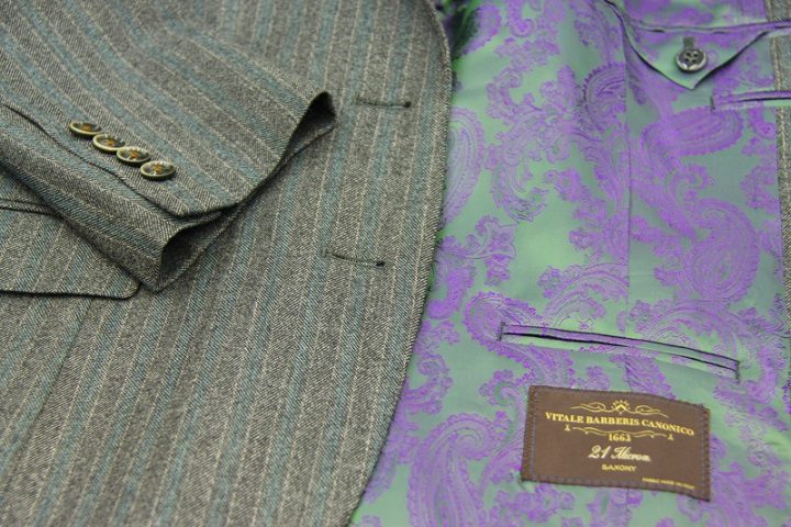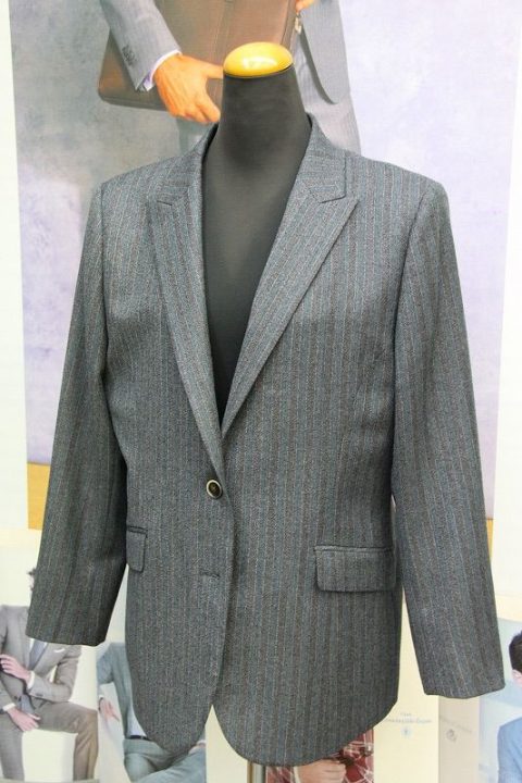 素材感のある織りがオシャレなgrayのカノニコ「サキソニー21micron」レディーススーツお仕上がり品でございます。さて今回はgreenにパープルのペイズリー柄があしらわれたviscose裏地とbrownのItaly製ボタンをコーディネートされておりますね。gorgeousでございます。私共では女医さんをはじめとします医療関係者の方々に加え、最近ではキャリアウーマンの方々からも少なからずレディーススーツのご注文を賜っております。ご興味のございます方はご検討賜りますと幸いでございます。