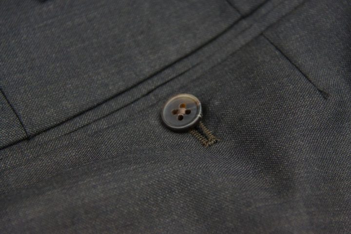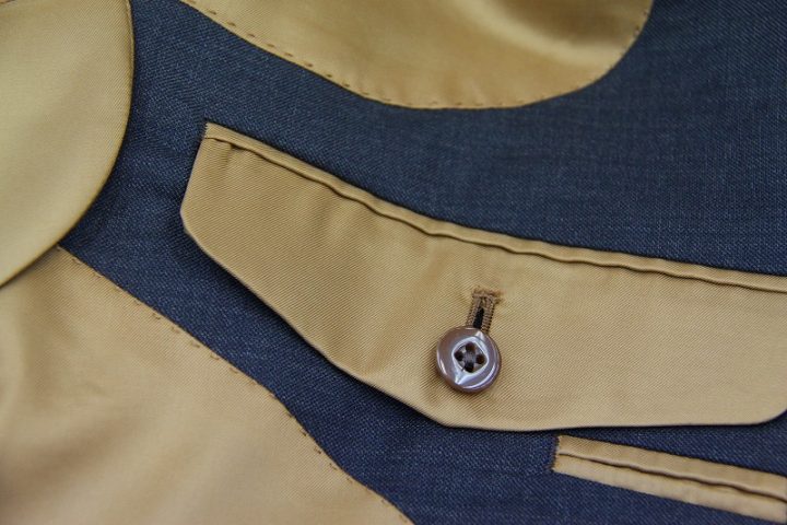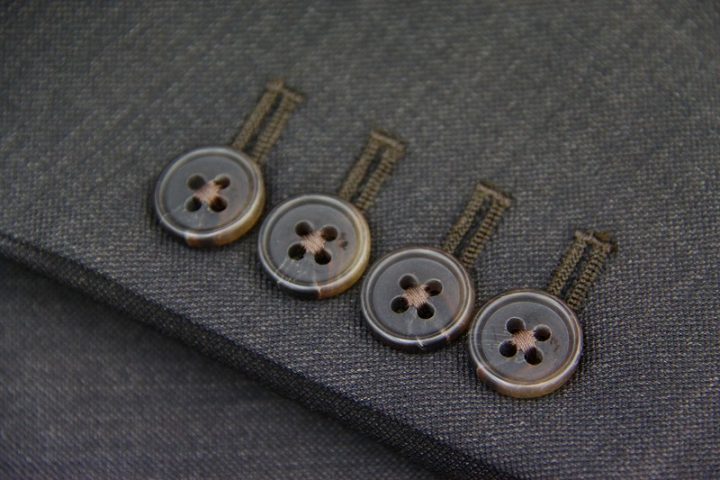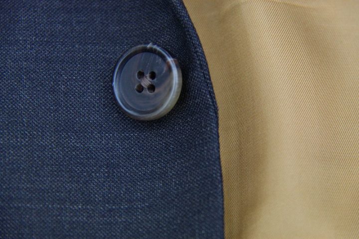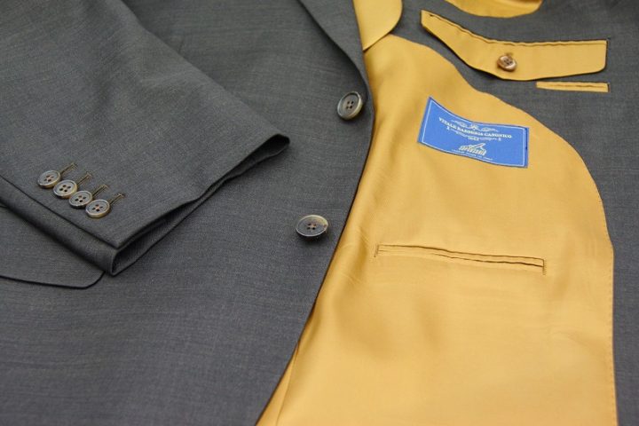 ダークブラウンのカノニコ「スーパーソニック」スーツお仕上がり品でございます。さて今回はocher(オーカー)と申し上げれば良いのかな、綺麗なカラーの裏地とbrownのボタンをコーディネートされておりますね。素敵でございます。オシャレな一着がお仕立て上りました。