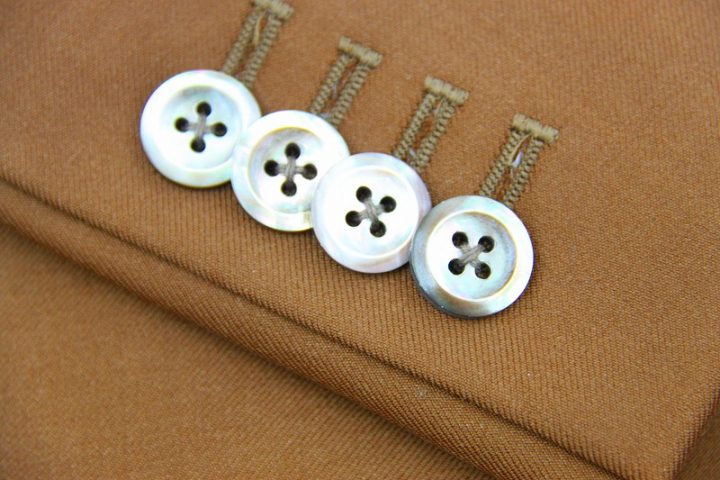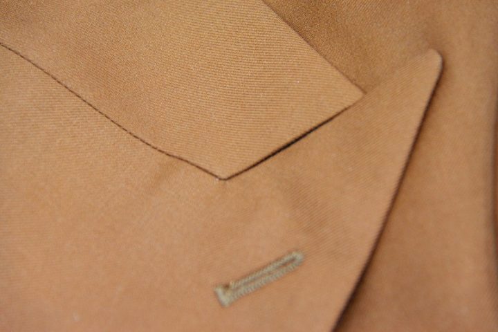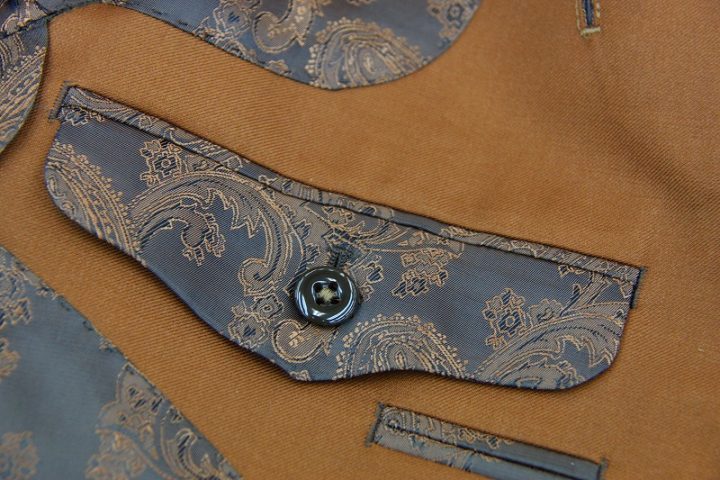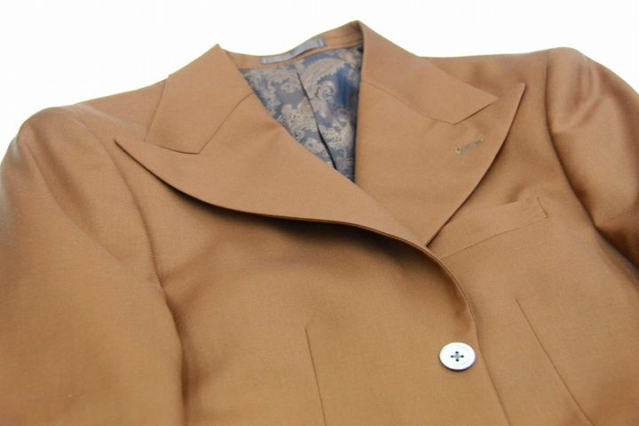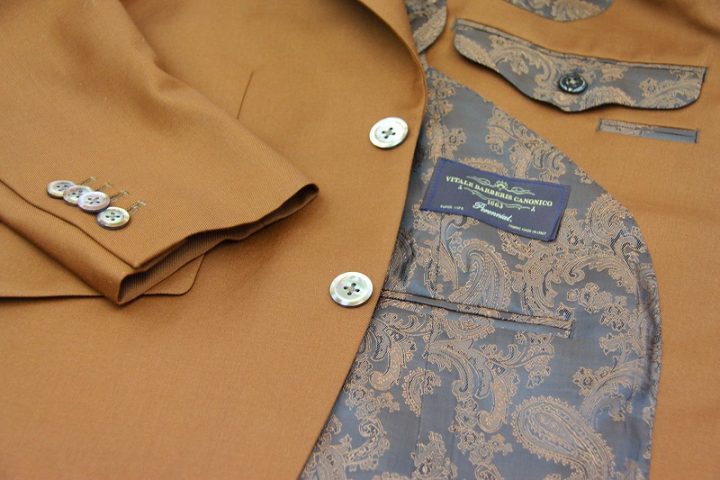BrownとOrangeの中間色とでも申し上げればいでしょうか、飴色とでも申し上げれば良いでしょうか、綺麗なカラーの「カノニコ ペレニアル」ジャケットお仕上がり品でございます。さて今回はbrownのペイズリー柄viscose裏地とシェルボタンをコーディネートされておりますね。素敵でございます。オシャレな一着がお仕立て上りました。