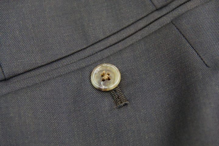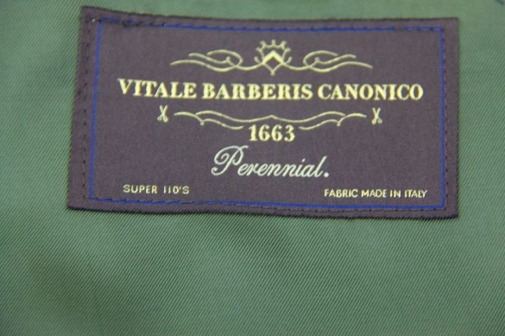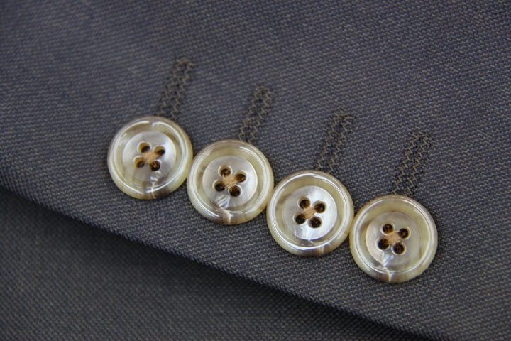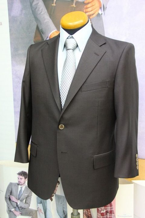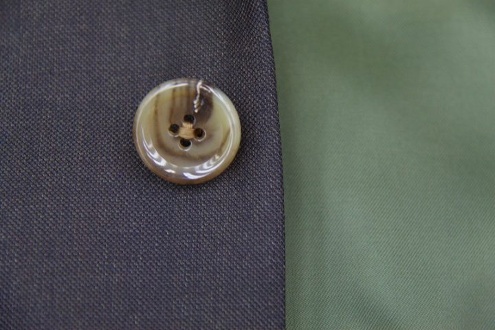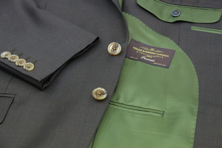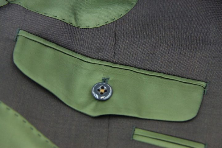 Brown無地の「カノニコ ペレニアル」スーツお仕上がり品でございます。さて今回はgreenの裏地とlight brownのボタンをコーディネートされておりますね。素敵でございます。オシャレな一着がお仕立て上りました。
