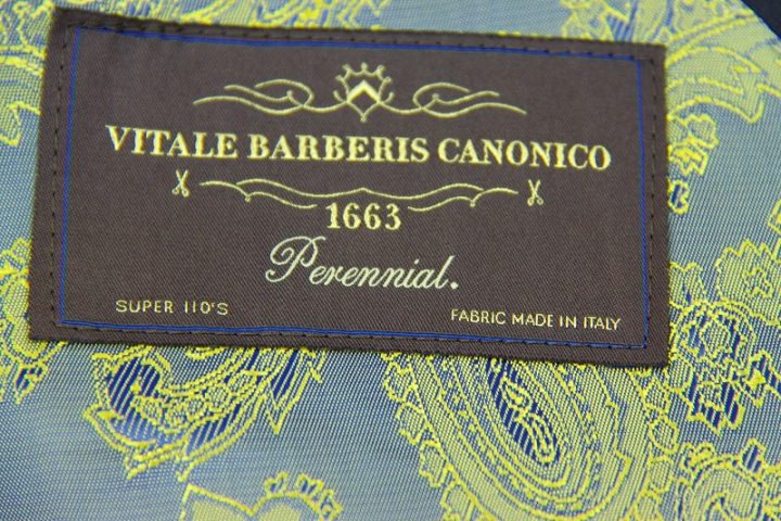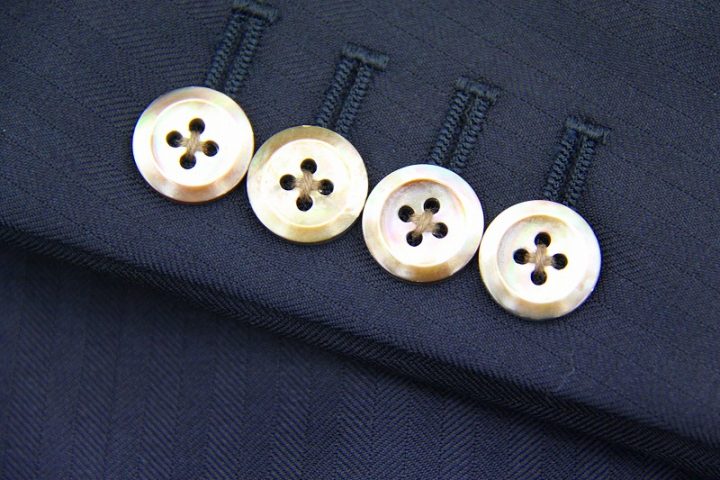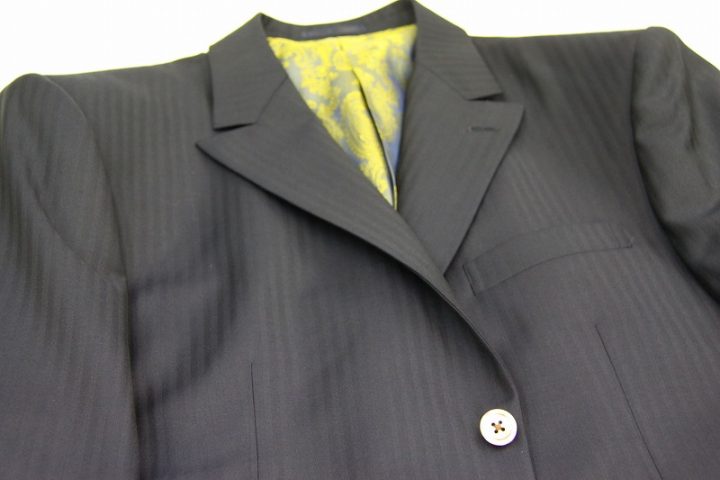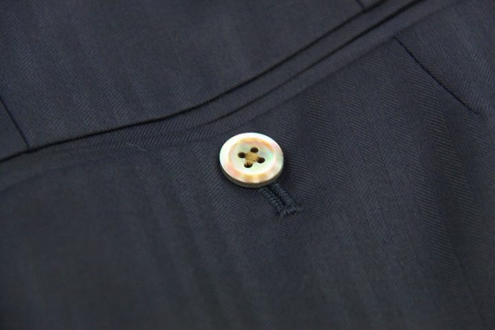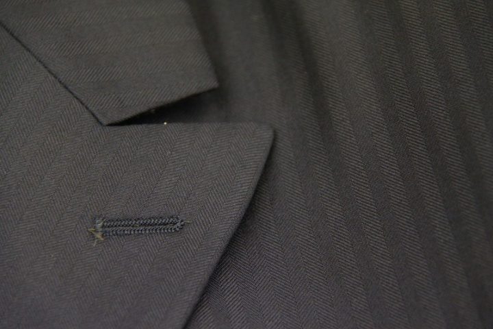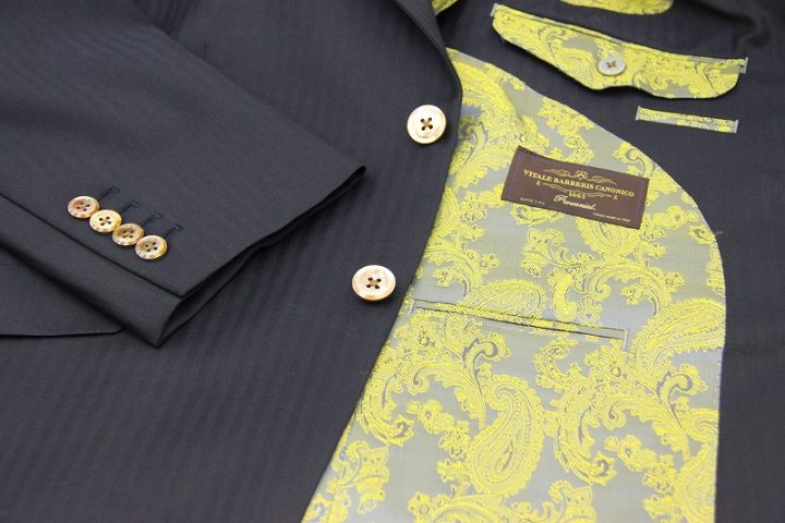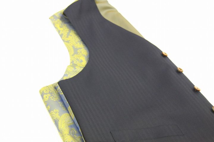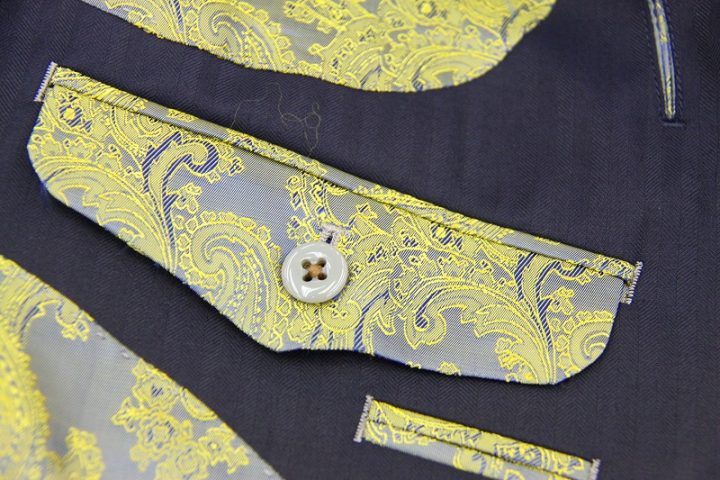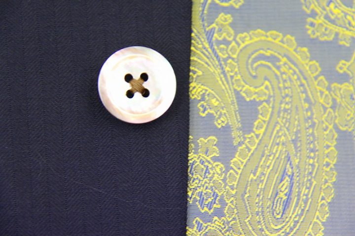 Herringbone柄がお洒落なネイビーの「カノニコ ペレニアル」3ピーススーツお仕上がり品でございます。さて今回はyellow(gold?)のペイズリー柄が目を引くviscose裏地とbrownのシェルボタンをコーディネートされておりますね。素敵でございます。オシャレな一着がお仕立て上りました。