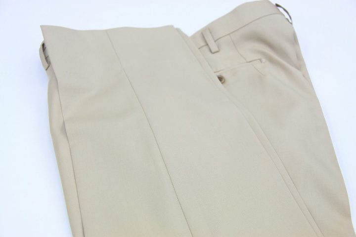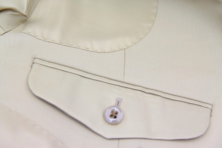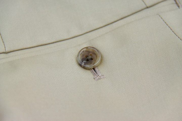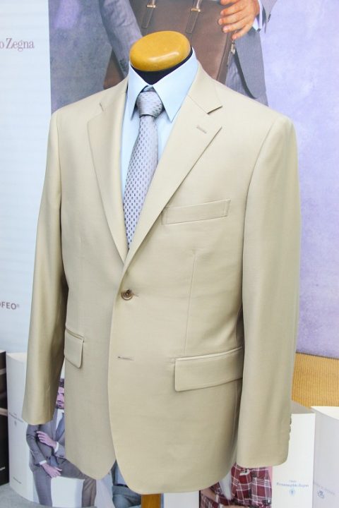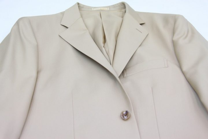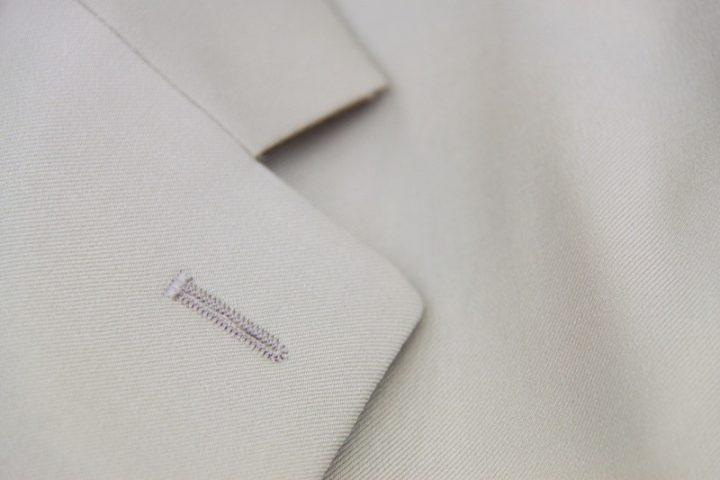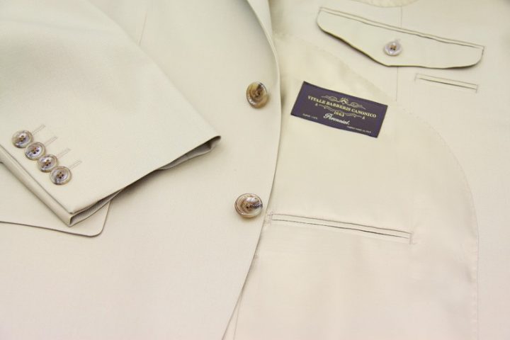 Elegantなベージュ無地の「カノニコ ペレニアル」スーツお仕上がり品でございます。さて今回は同系色の裏地とボタンをコーディネートされておりますね。素敵でございます。オシャレな大人の一着がお仕立て上りました。