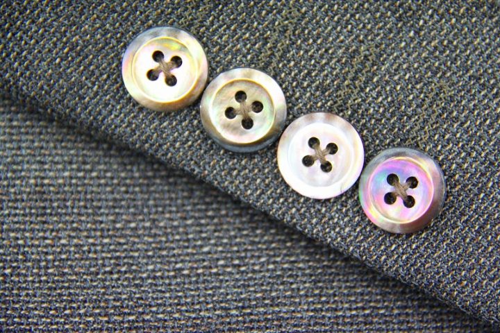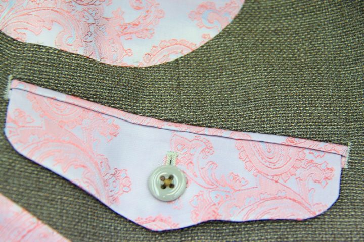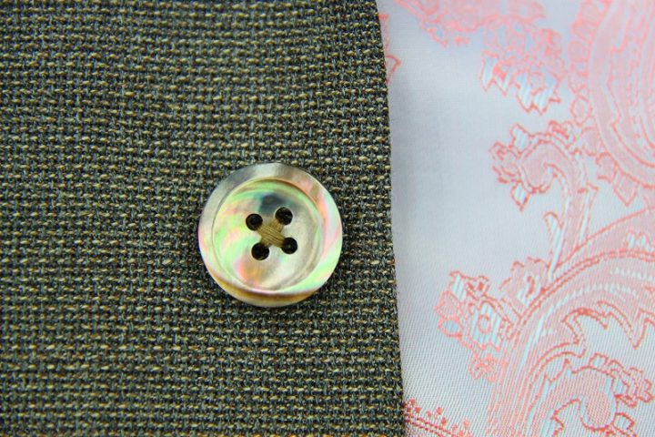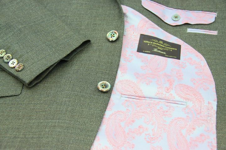 素材感のある織りがお洒落なカノニコ「モンテカルロ」ジャケットお仕上がり品でございます。さて今回はpinkのペイズリー柄が目を引くviscose裏地とbrownのシェルボタンをコーディネートされておりますね。素敵です。オシャレな一着がお仕立て上がりました。