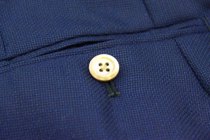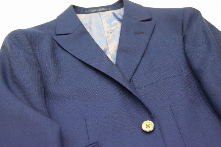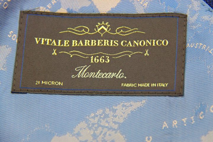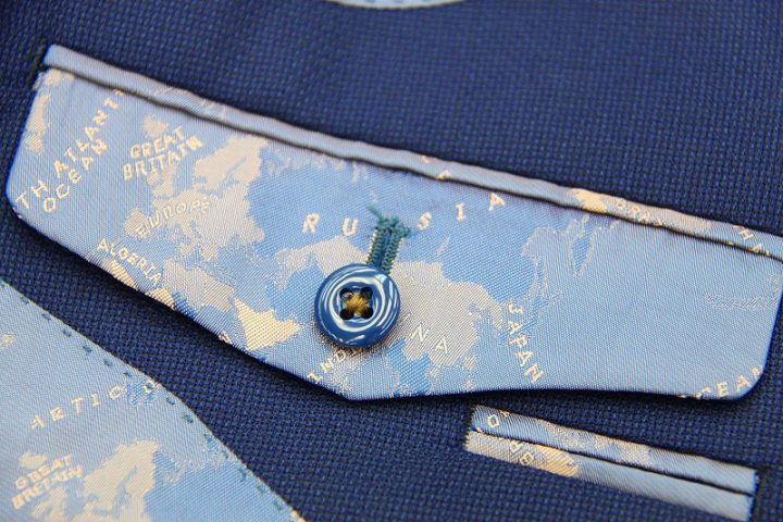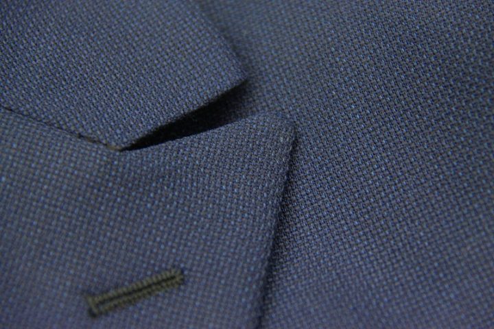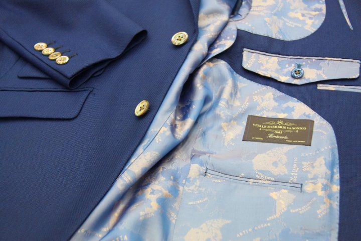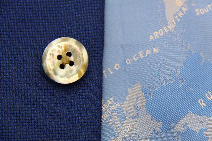 Navyのカノニコ「モンテカルロ」セットアップスーツお仕上がり品でございます(昨日同じ生地で掲載のジャケットとは全く別でございます)。このメッシュ織りのジャケットは私共ではもはや定番と言っても良いほどの人気があるのでございます。シワになり難く耐久性もございますので使い勝手も抜群だからかな。さて今回はブルーグレーのworld map柄viscose裏地とブラウンのshellボタンをコーディネートされておりますね。素敵です。オシャレな一着がお仕立て上がりました。