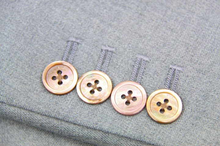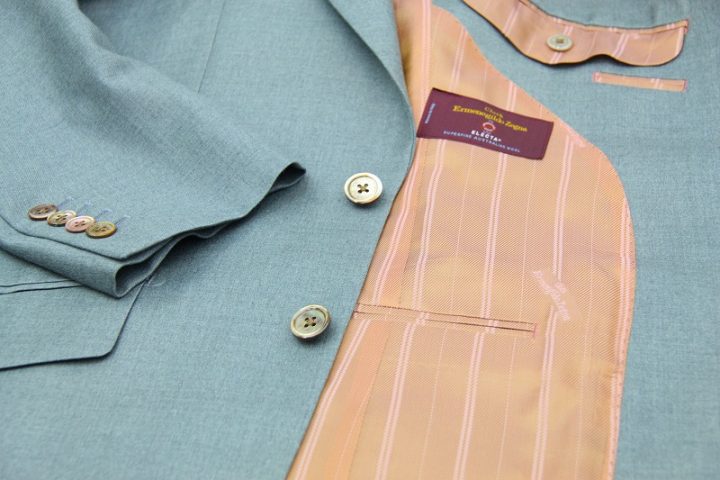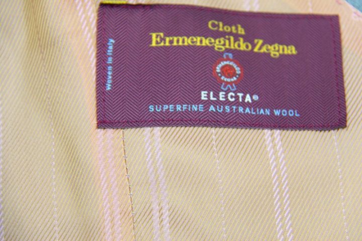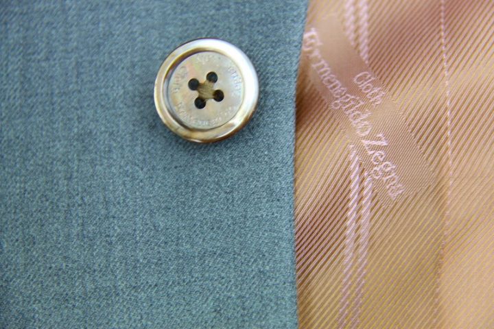 爽やかなlight grayのゼニア「エレクタ」スーツお仕上がり品でございます。さて今回はサーモンピンクのゼニア純正ロゴ入りキュプラ裏地とブラウンのshellボタンをコーディネートされておりますね。素敵でございます。シルクのような光沢とカシミアような柔らかさで多くの方を魅了しているゼニア。お勧めでございます。