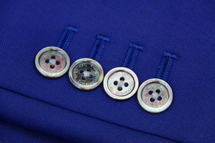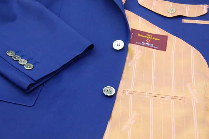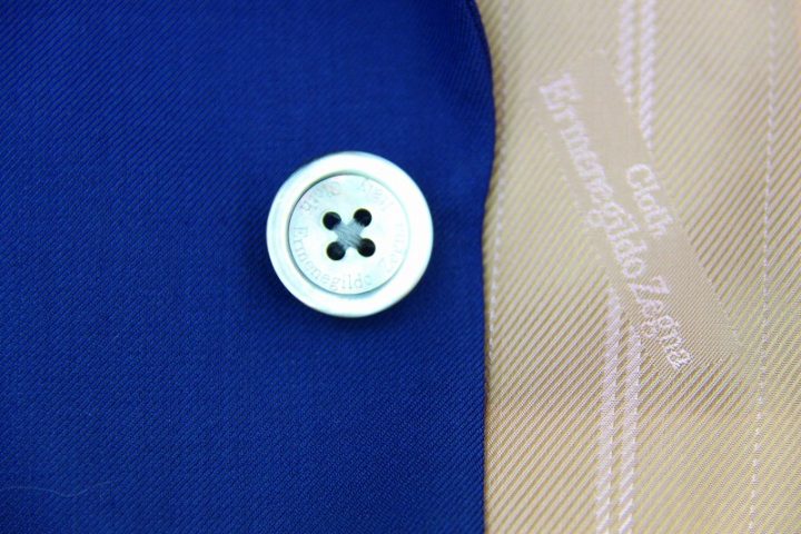 鮮やかなblueのゼニア「トラベラー」スーツお仕上がり品でございます。さて今回サーモンピンクのゼニア純正ロゴ入りキュプラ裏地とブラックのshellボタンをコーディネートされておりますね。素敵でございます。シルクのような光沢とカシミアような柔らかさで多くの方を魅了しているゼニア。お勧めでございます。