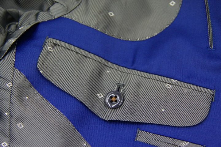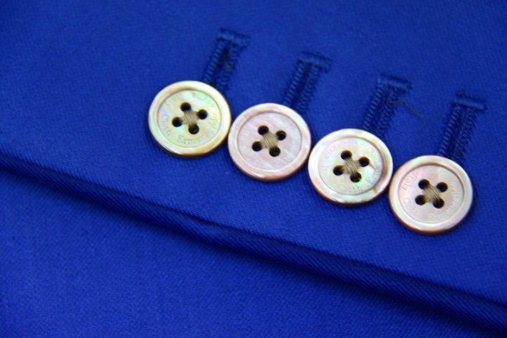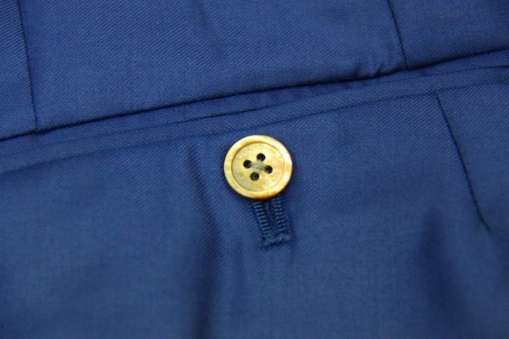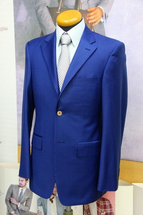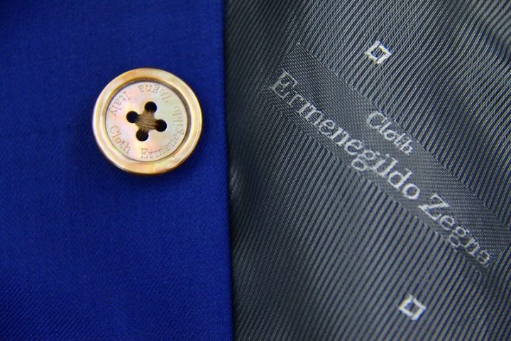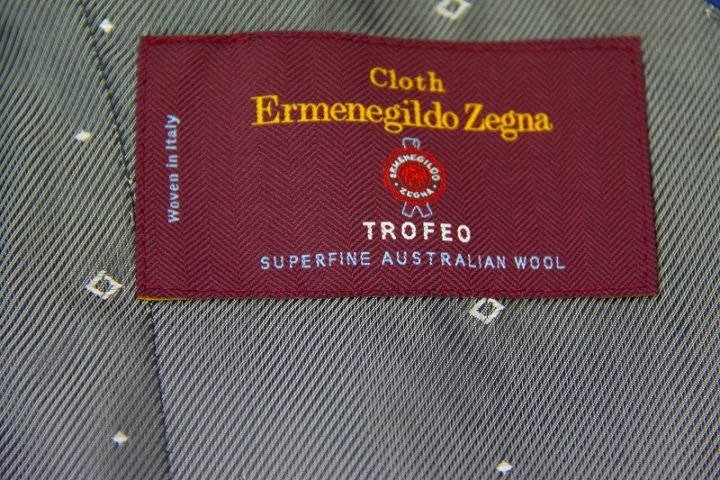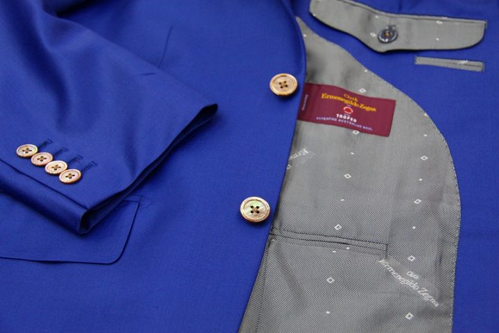 鮮やかなblueのゼニア「トロフェオ」スーツお仕上がり品でございます。さて今回はgrayのゼニア純正ロゴ入りキュプラ裏地とbrownのシェルボタンをコーディネートされておりますね。素敵でございます。シルクのような光沢感とカシミアような柔らかさで多くの方を魅了しているトロフェオ。お勧めでございます。