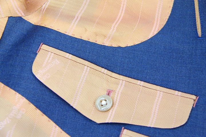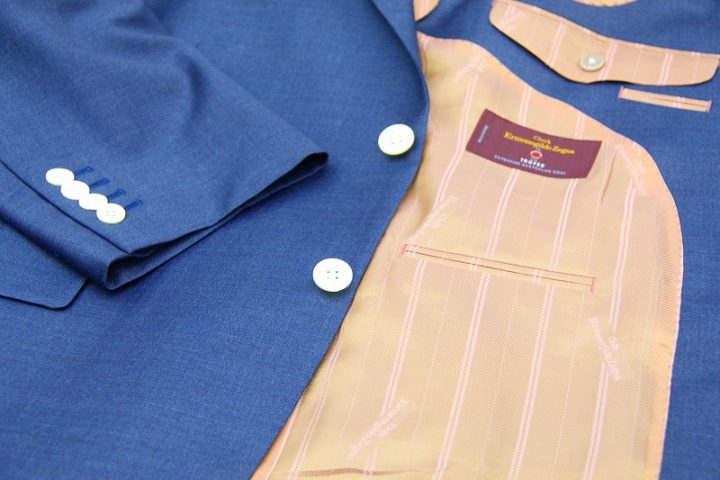 Silkyなブルーグレーのゼニア「トロフェオ」スーツお仕上り品でございます。さて今回はサーモンピンクのゼニア純正ロゴ入りキュプラ裏地とホワイトのshellボタンをコーディネートされておりますね。素敵でございます。上質な大人の一着がお仕立て上がりました。