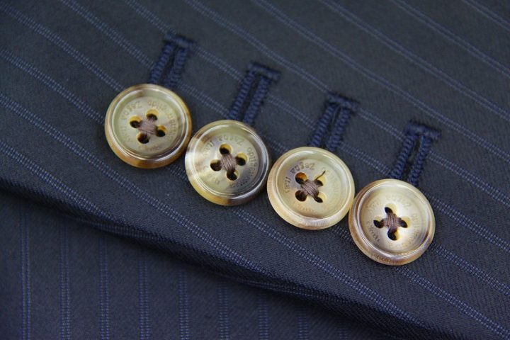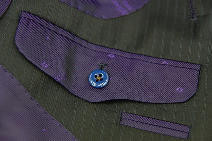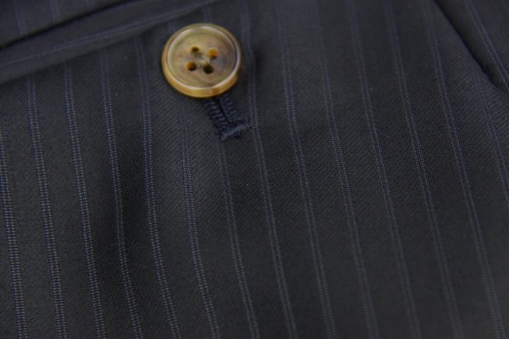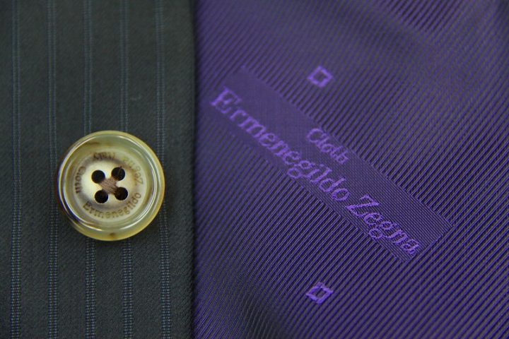 穏やかなストライプ柄がお洒落なnavyのゼニア「トロフェオ」スーツお仕上り品でございます。さて今回はpurpleのゼニア純正ロゴ入りキュプラ裏地と水牛ボタンをコーディネートされておりますね。素敵でございます。上質な大人の一着がお仕立て上がりました。