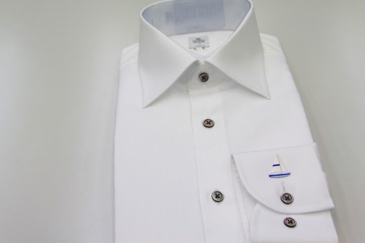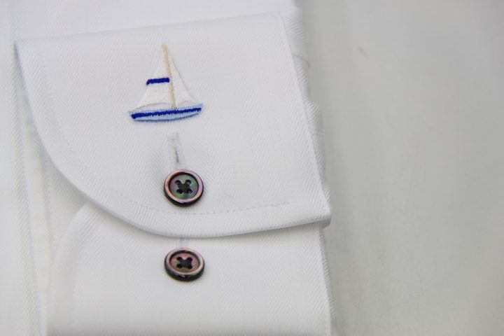 Herringbone柄がオシャレなホワイトのThomasmason long sleeve shirtお仕上がり品でございます。さて今回は⛵の刺繍と黒蝶貝のボタンをコーディネートされておりますね。素敵でございます。英国王室御用達ブランド「トーマスメイソン」。ご興味のございます方はご検討賜りますと幸いでございます。