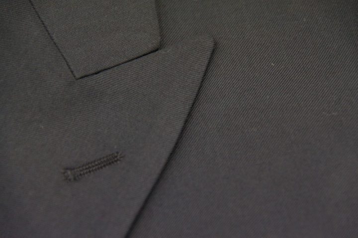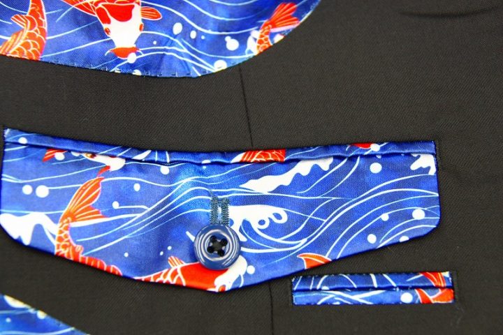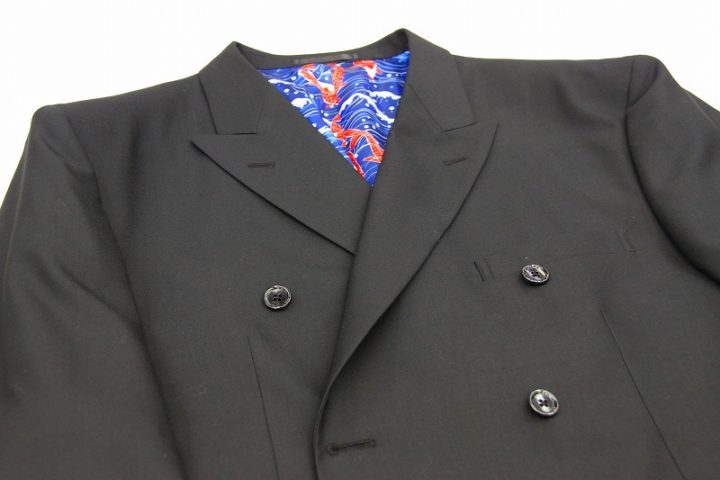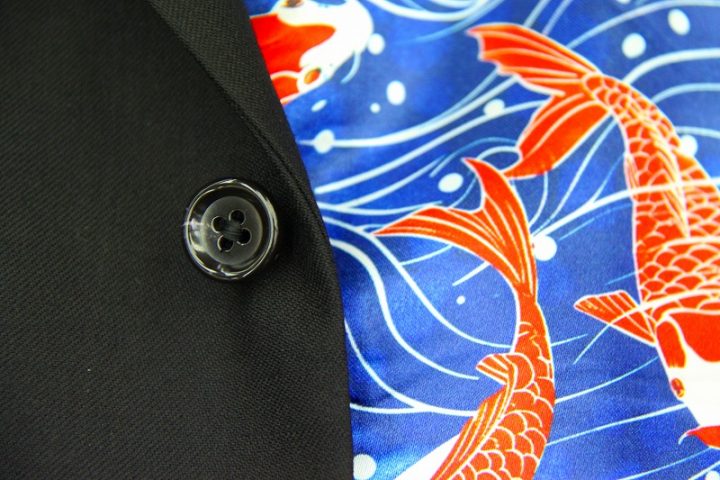 Blackのミユキ毛織ピュアウールスーツお仕上がり品でございます。さて今回はたくさんの錦鯉が泳いでいるfancyな裏地とconservativeなブラックのボタンをコーディネートされておりますね。素敵でございます。上質な国産ウール、ご興味のございます方はご検討賜りますと幸いでございます。