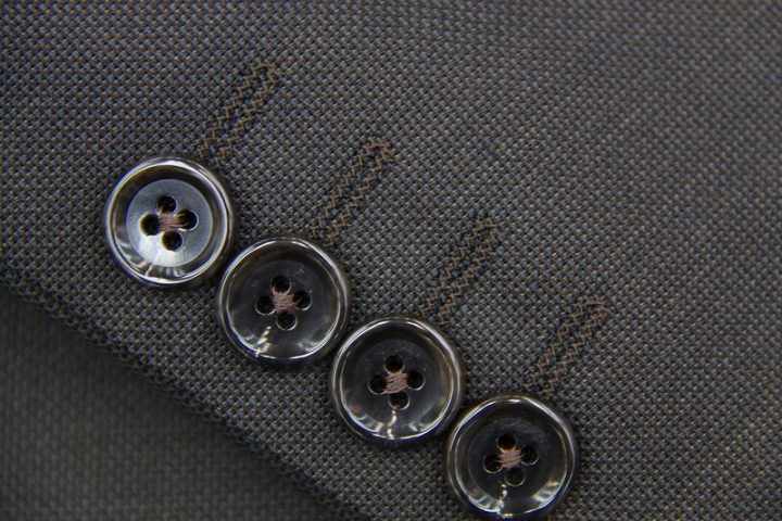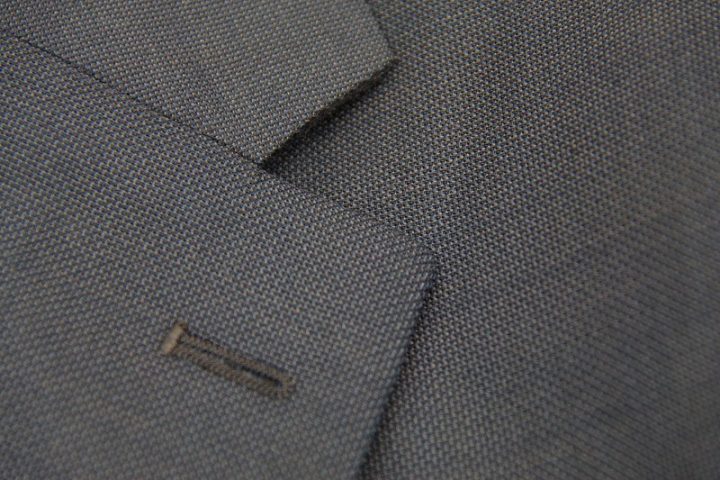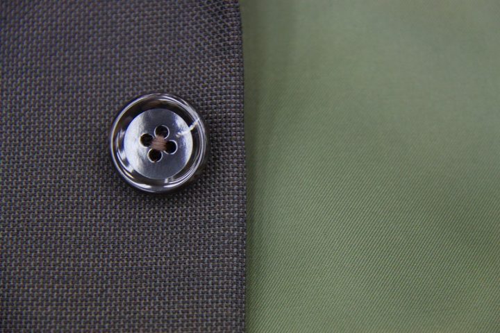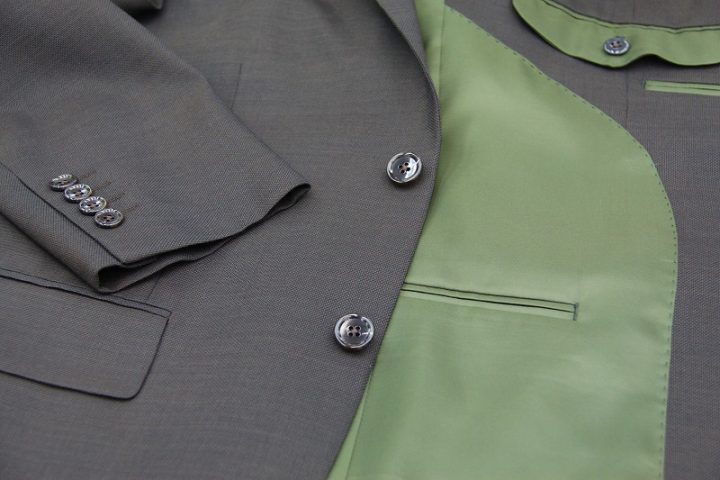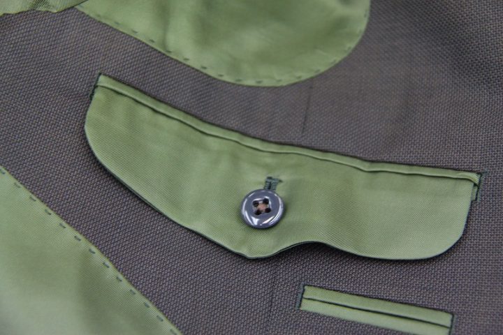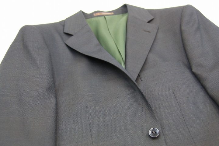 素材感のある織りがオシャレなチャコールグレーのミユキ毛織ピュアウールスーツお仕上がり品でございます。さて今回はgreenの裏地とbrownのボタンをコーディネートされておりますね。素敵でございます。上質な国産ウール、ご興味のございます方はご検討賜りますと幸いでございます。