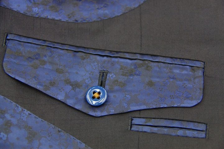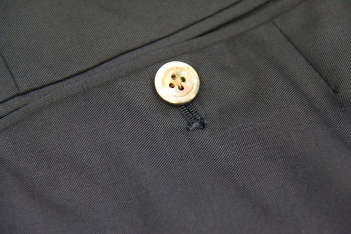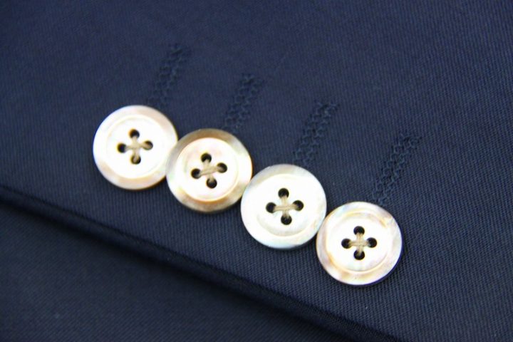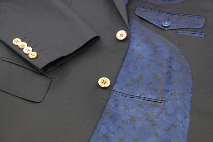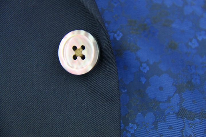 Navy無地の「ミユキ毛織」ピュアウールスーツお仕上がり品でございます。さて今回は同系色のfloralキュプラ裏地とブラウンのshellボタンをコーディネートされておりますね。素敵でございます。上質な国産ウール、ご興味のございます方はご検討賜りますと幸いでございます。