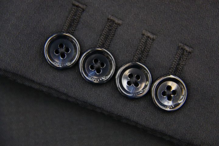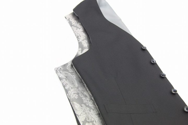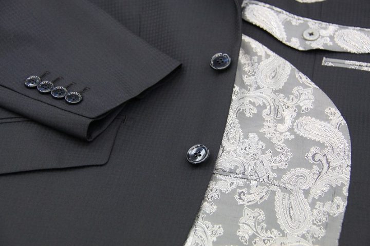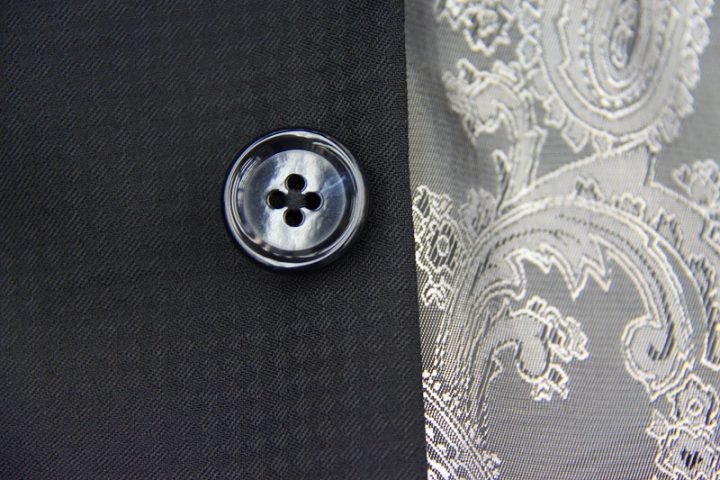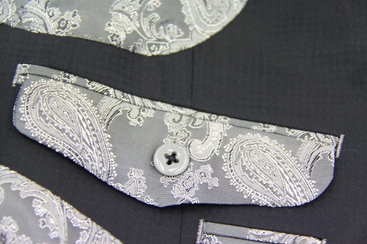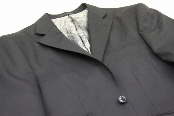 Silkyなブラックの「ミユキ毛織」ピュアウールスーツお仕上がり品でございます。さて今回はgrayのペイズリー柄が目を引くviscose裏地とnavyのボタンをコーディネートされておりますね。オシャレでございます。上質な国産ウール、ご興味のございます方はご検討賜りますと幸いでございます。