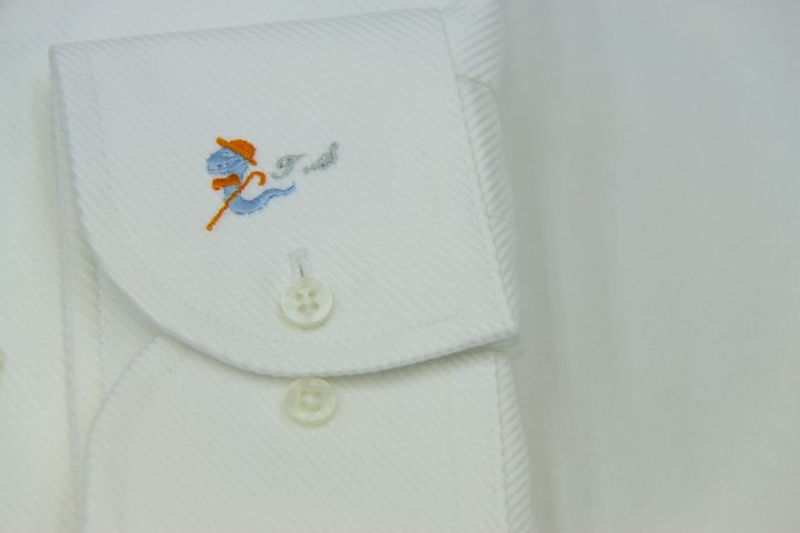 SilkyなキャバリーツイルのMORARJEE white shirtお仕上がり品でございます。さて今回は”かわいい”🐍の刺繍とshellボタンをコーディネートされておりますね。素敵でございます。最近私共で人気急上昇のモラルジー。ご興味のございます方はご検討賜りますと幸いでございます。