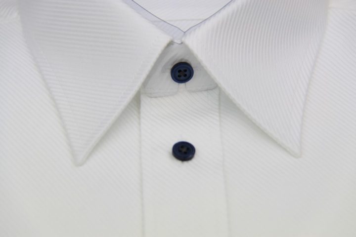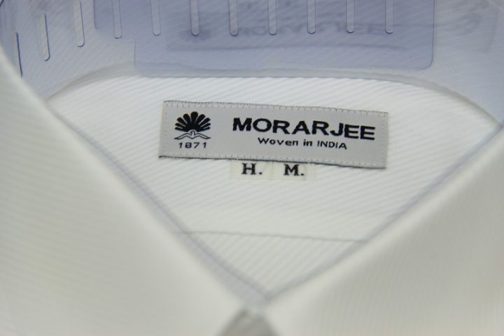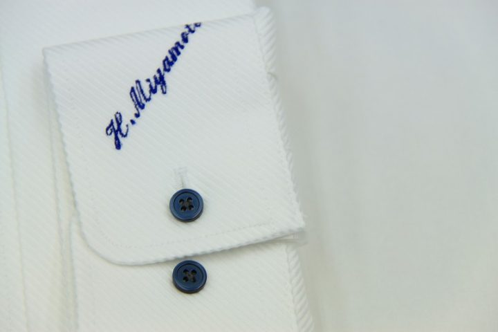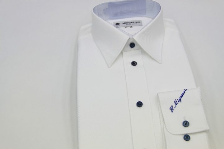 SilkyなキャバリーツイルのMORARJEE white shirtお仕上がり品でございます。さて今回はnavyの刺繍ネームとボタンをコーディネートされておりますね。素敵でございます。最近私共で人気急上昇のモラルジー。ご興味のございます方はご検討賜りますと幸いでございます。