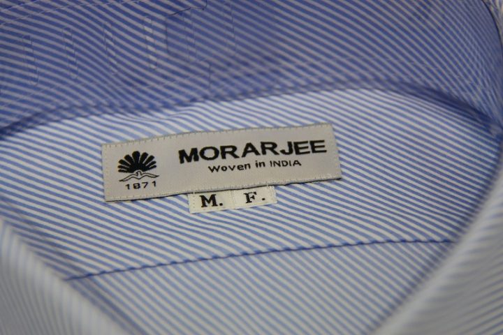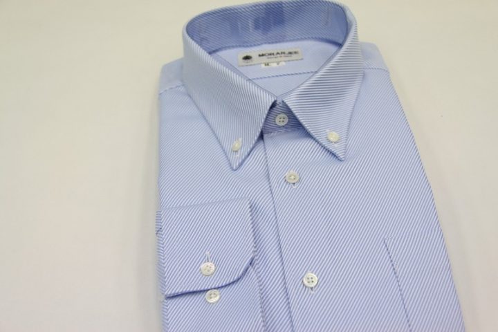 綺麗なブルーのMORARJEE long sleeve shirtお仕上がり品でございます。さて今回は白蝶貝のボタンをコーディネートされておりますね。素敵でございます。最近私共で人気急上昇のモラルジー。ご興味のございます方はご検討賜りますと幸いでございます。