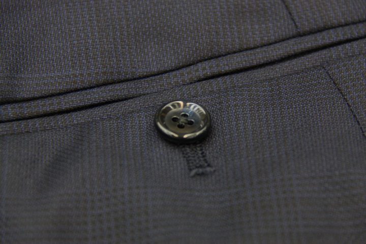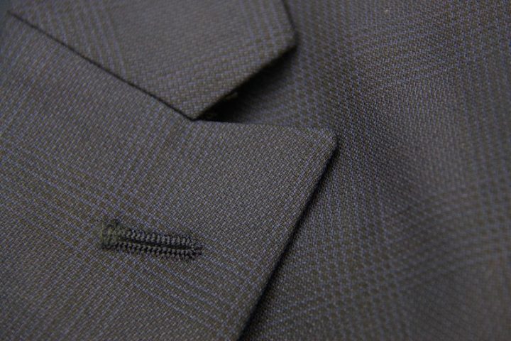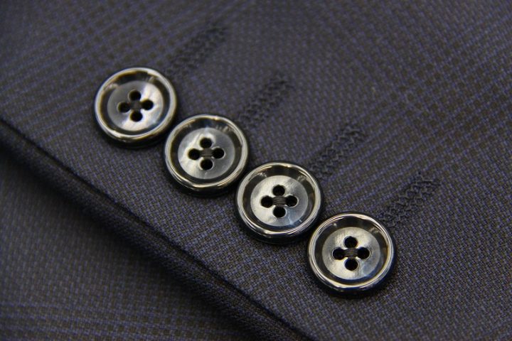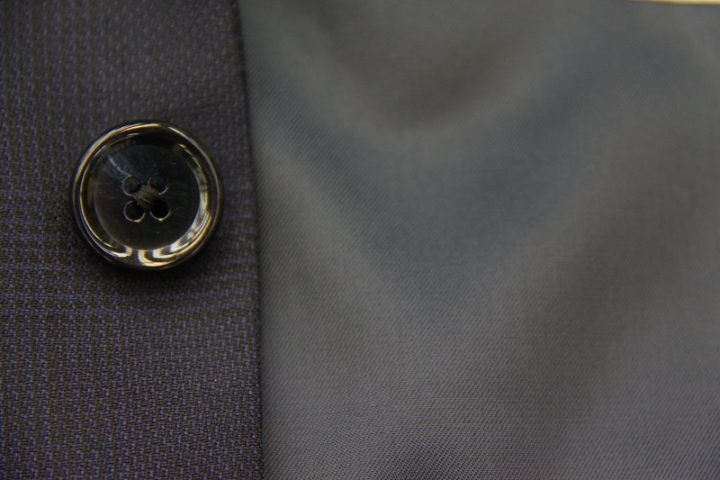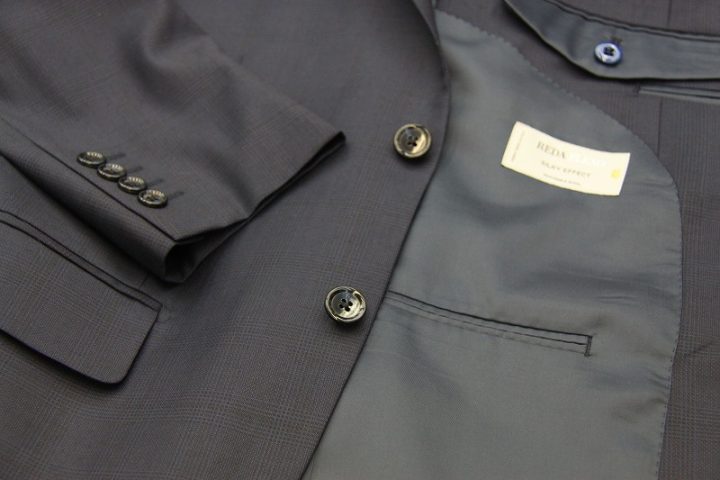 シャドーチェック柄がオシャレなnavyの「レダ  シルキーエフェクト」スーツお仕上がり品でございます。さて今回はネイビーの裏地とボタンをコーディネートされておりますね。シックで素敵でございます。オシャレな大人の一着がお仕立て上りました。