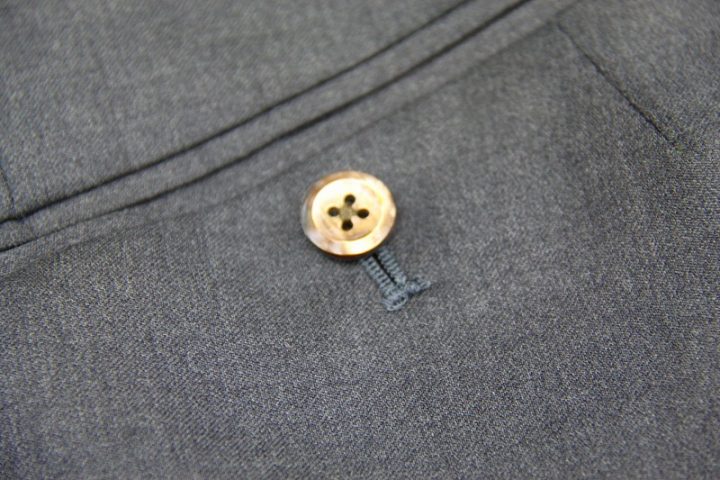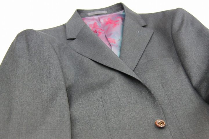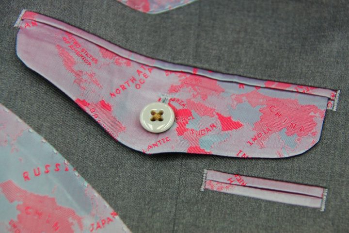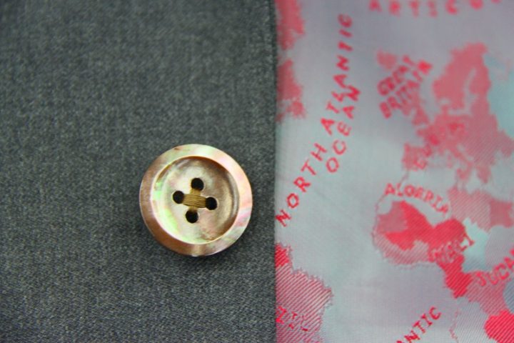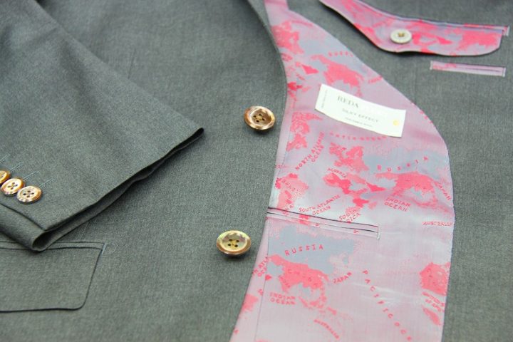 Silkyなグレー無地の「レダ フレクソ シルキーエフェクト」スーツお仕上がり品でございます。さて今回はボルドーのworld map柄viscose裏地とブラウンのshellボタンをコーディネートされておりますね。素敵でございます。オシャレな大人の一着がお仕立て上りました。