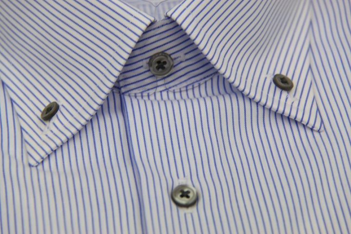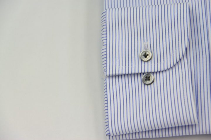 Blueのストライプ柄がお洒落な国産long sleeve shirtお仕上がり品でございます。さて今回は黒蝶貝のボタンをコーディネートされておりますね。素敵でございます。上質な国産シャツ。ご興味のございます方はご検討賜りますと幸いでございます。