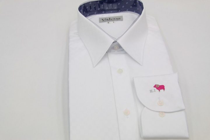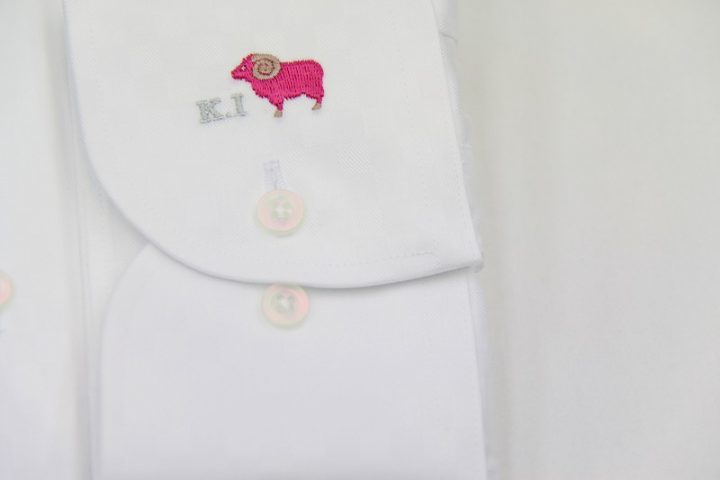 Silkyなホワイト無地の国産long sleeve shirtお仕上がり品でございます。さて今回は”かわいい”pink sheepの刺繍とオーロラボタンをコーディネートされておりますね。素敵でございます。上質な国産シャツ。ご興味のございます方はご検討賜りますと幸いでございます。