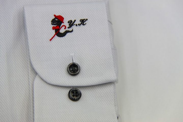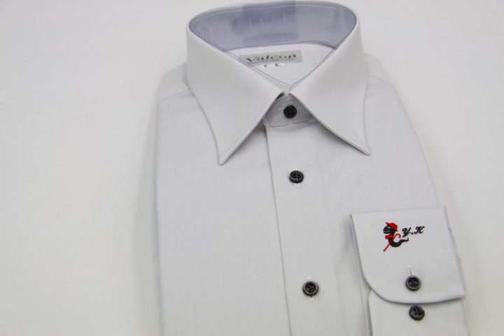 Light gray無地の国産long sleeve shirtお仕上がり品でございます。さて今回は”かわいい”black snakeの刺繍と3㎜厚ボタンをコーディネートされておりますね。素敵です。上質な国産シャツ。ご興味のございます方はご検討賜りますと幸いでございます。