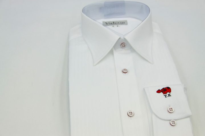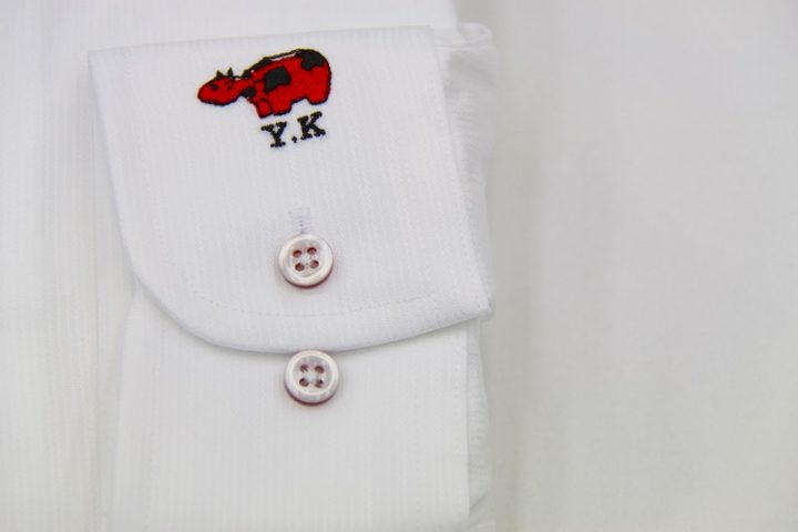 繊細な織り柄がオシャレな国産white shirtお仕上がり品でございます。さて今回は”かわいい”🐄の刺繍とsandwichボタンをコーディネートされておりますね。素敵です。上質な国産シャツ。ご興味のございます方はご検討賜りますと幸いでございます。