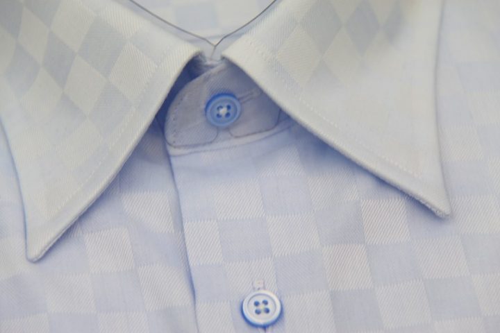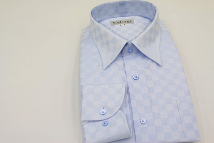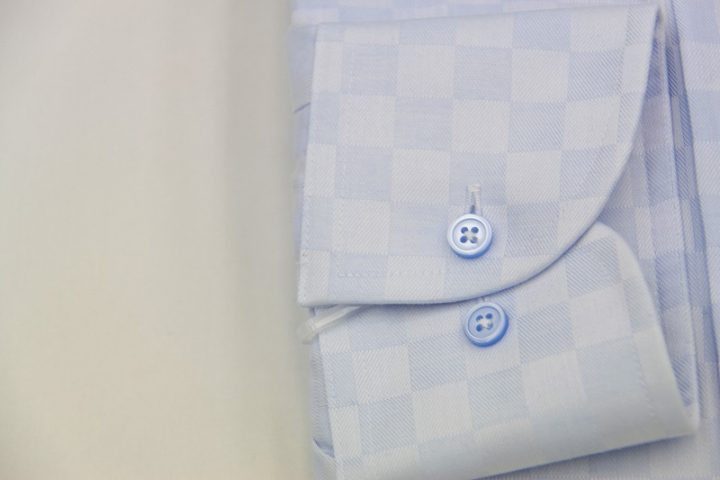 市松模様柄がオシャレなlight blueの国産long sleeve shirtお仕上がり品でございます。さて今回は同系色のボタンをコーディネートされておりますね。シックで素敵です。上質な国産シャツ。ご興味のございます方はご検討賜りますと幸いでございます。