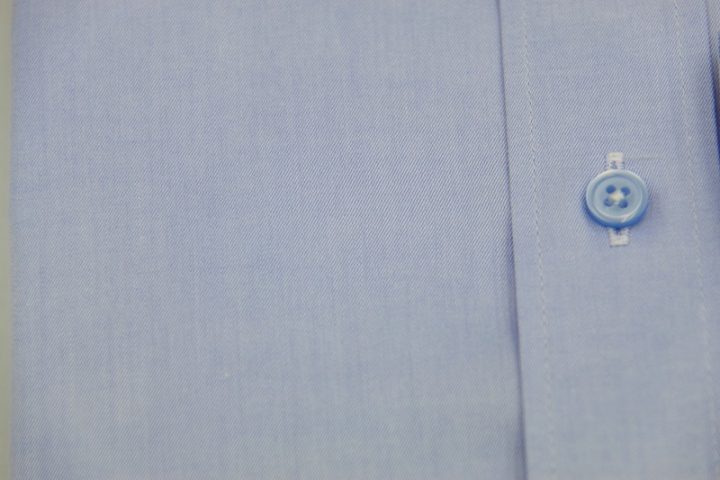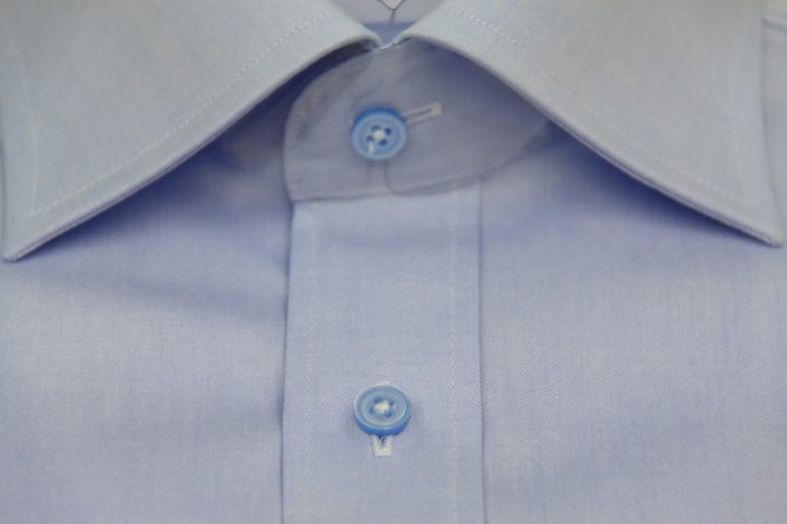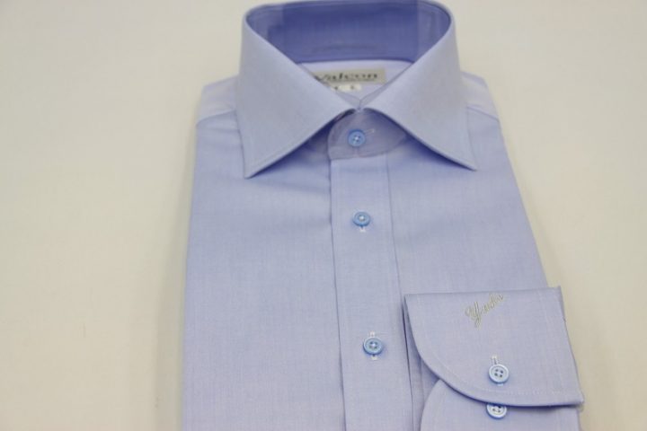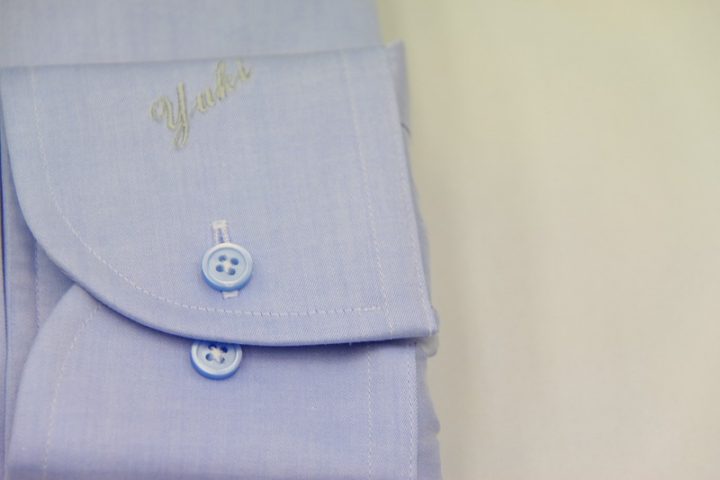 Blue無地の国産long sleeve shirtお仕上がり品でございます。さて今回はシルバーグレーの刺繍ネームとライトブルーのボタンをコーディネートされておりますね。素敵でございます。上質な国産シャツ。ご興味のございます方はご検討賜りますと幸いでございます。